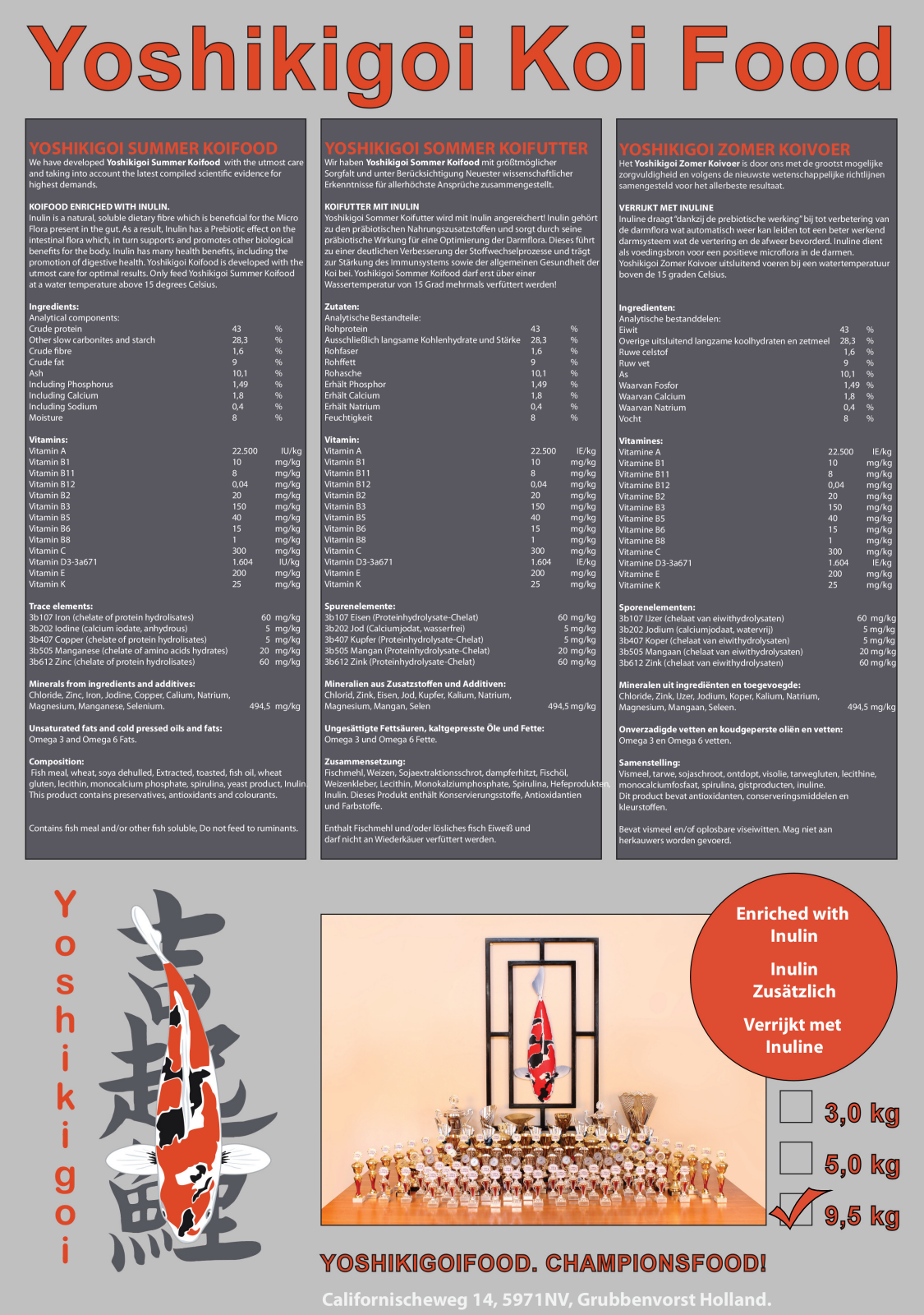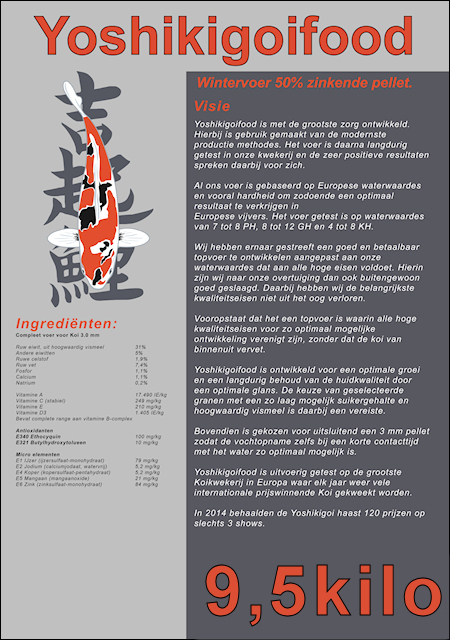 Vanaf 1/1/2023 hebben YOSHIKIGOI Grubbenvorst, YOSHIKIGOI Polen en KIYOMIZU LIFE STAGE KOI FOOD besloten om een intensieve samenwerking aan te gaan met betrekking tot visvoer. Dit omdat het distribueren van visvoer aan de particuliere klant niet tot de kernactiviteiten behoort van YOSHIKIGOI.Voor KIYOMIZU vormt het YOSHIKIGOI koi voer een interessante aanvulling op het assortment omdat het daarmee ook kleine koi kan voorzien van een kwaliteits product wat voor deze levens fase optimaal is.De verkoop van YOSHIKIGOI voer vindt dan ook vanaf heden door de verkoop punten van KIYOMIZU.Het YOSHIKIGOI voer assortiment is toegevoegd aan het KIYOMIZU assortiment. Zo is er vanaf heden een KIYOMIZU 3 mm verkrijgbaar. De KIYOMIZU 3 mm (JUVENILE) is gebaseerd op de YOSHIKIGOI formule. Deze formule is onveranderd gelaten op een enkele toevoeging van extra aditieven na zodat het volledig past in het KIYOMIZU LIFE STAGE FOOD program. Naast een 4.5 mm (JUNIOR), 6.0 mm (ADULT) en de 8.0 mm (JUMBO) bestaat er nu dus ook een 3.0 mm (JUVENILE).Voor vragen en opmerkingen kunt u zich melden bij Jos Aben (YOSHIKIGOI), Rene Kruter (KIYOMIZU) of Jeroen van Stokkom (VIVANI ANACP).